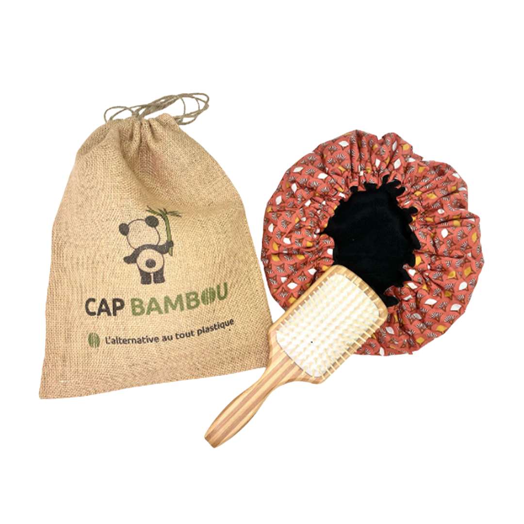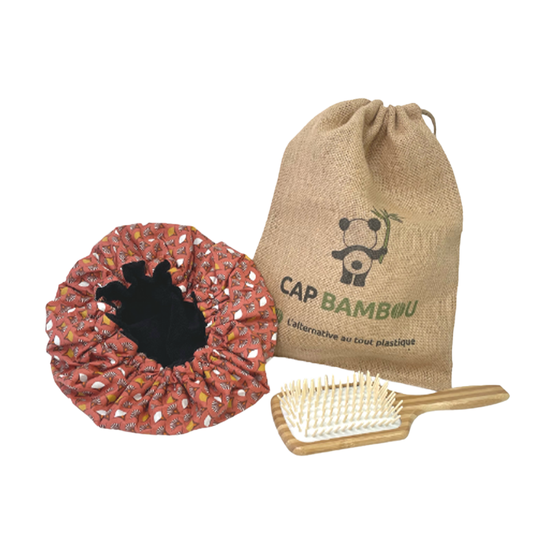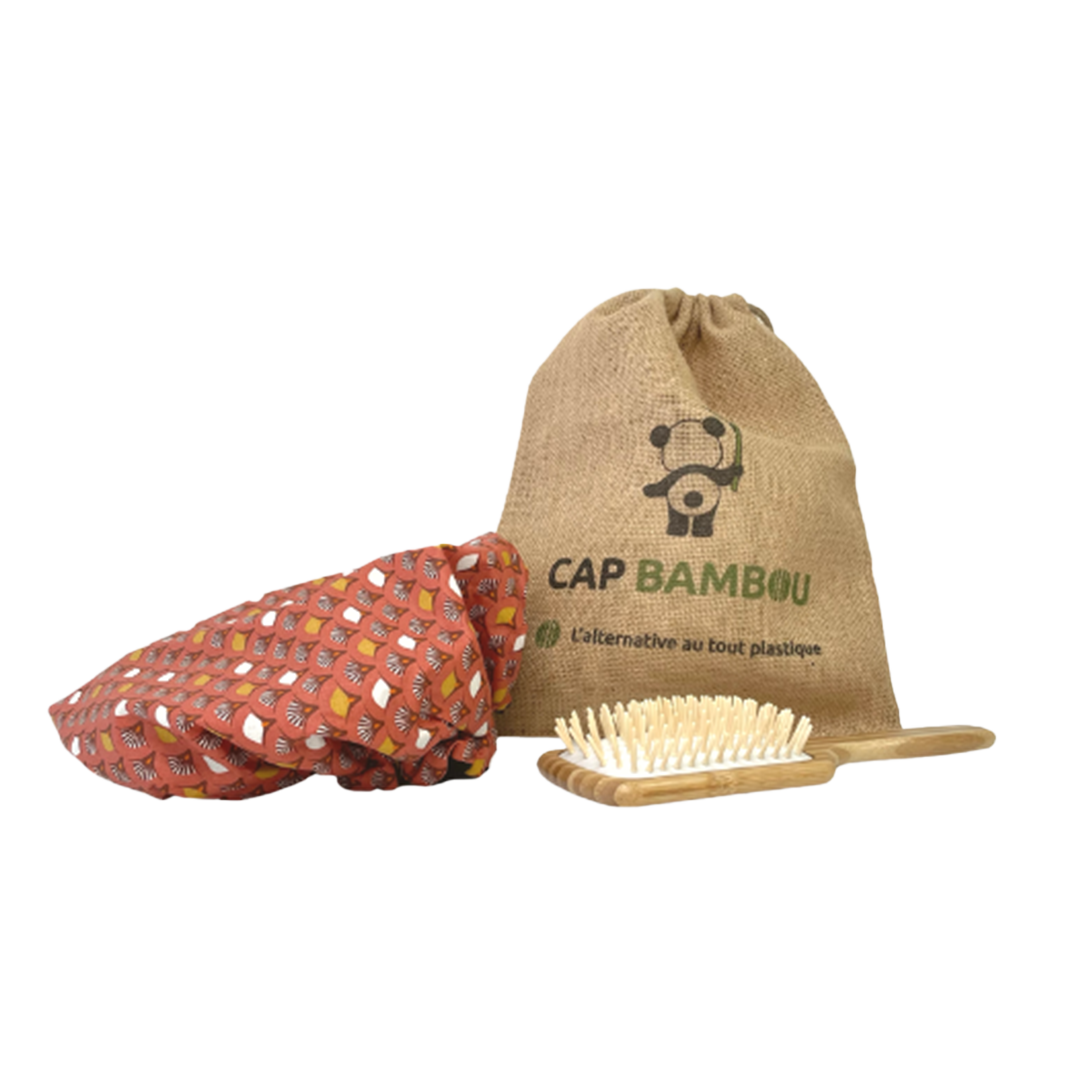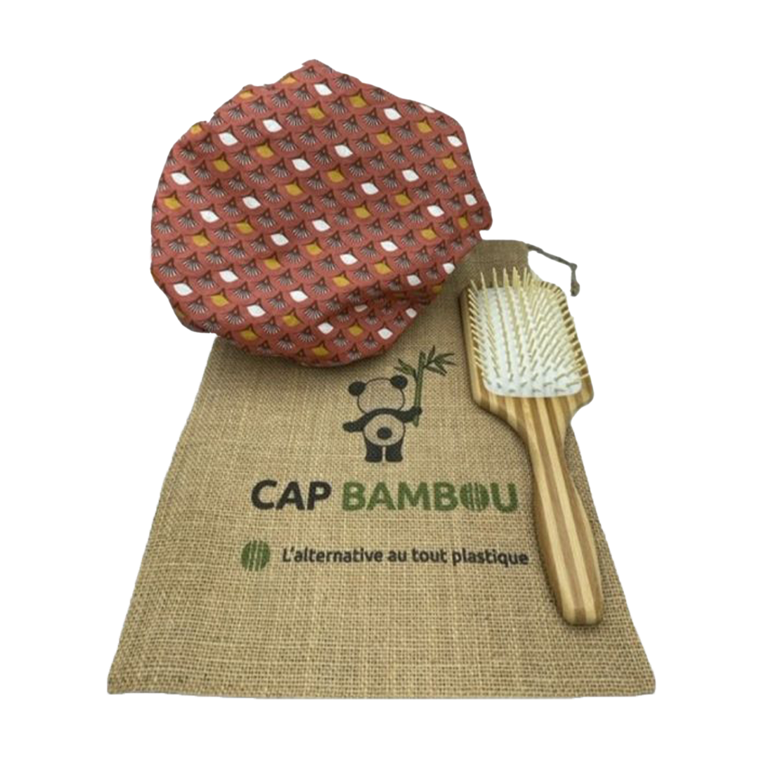 Notre box comprend une charlotte à cheveux réutilisable Made in France ainsi qu’une brosse à cheveux en bambou démêlante large
