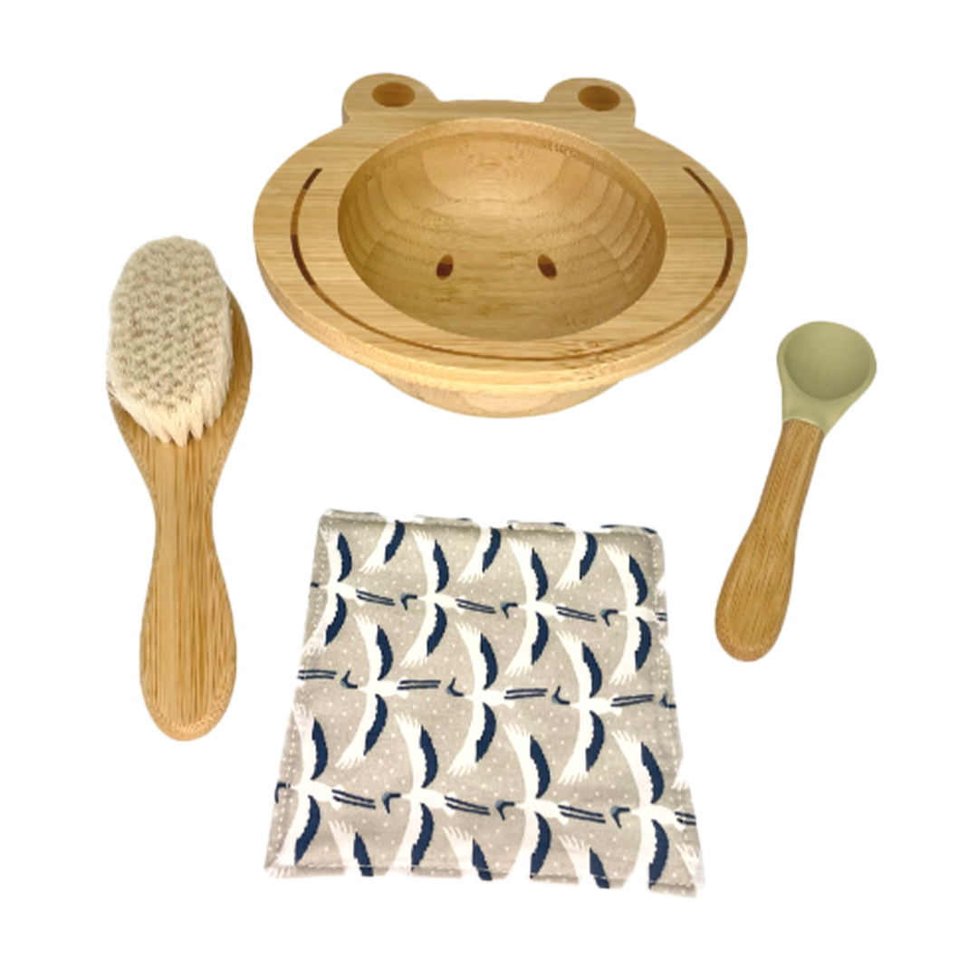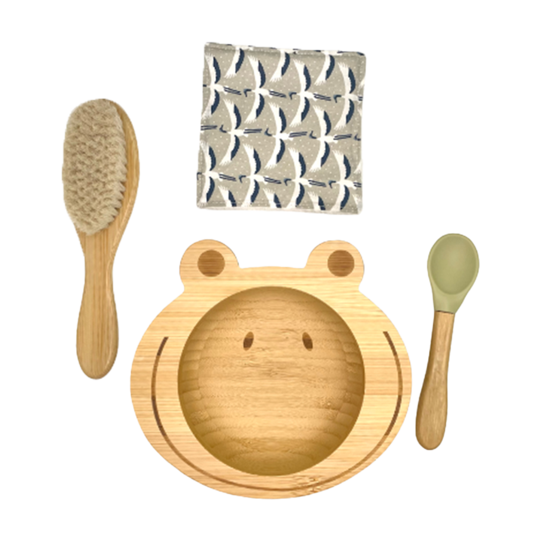 Elle comprend 1 set de repas bébé grenouille + 1 une brosse à cheveux bébé et 1 lingette lavable Made In France ! Le tout est livré dans une boîte cadeau en carton !