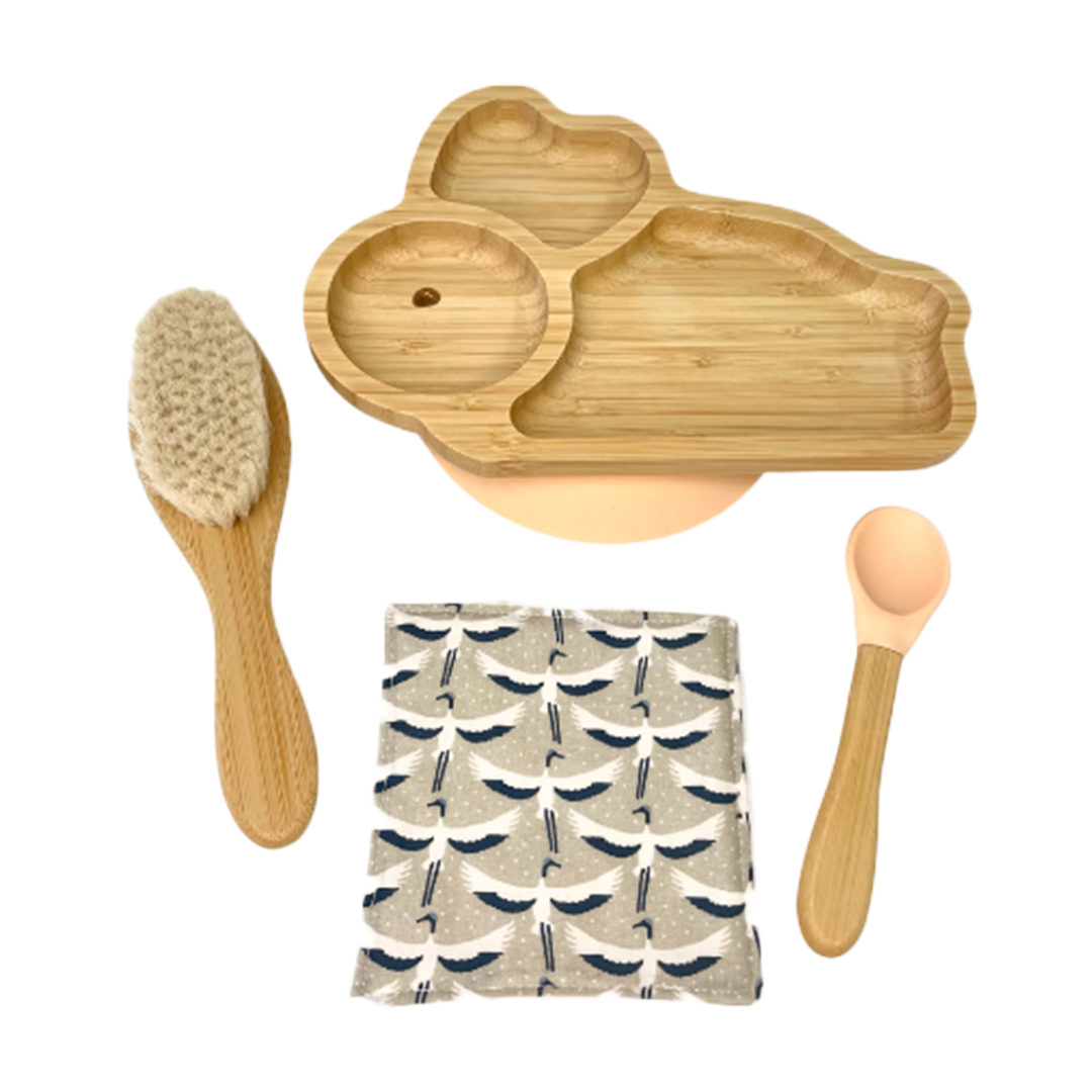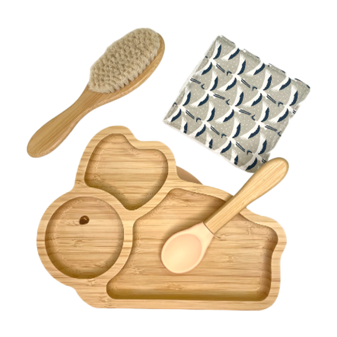 Elle comprend 1 set de repas bébé lapin + 1 une brosse à cheveux bébé et 1 lingette lavable Made In France ! Le tout est livré dans une boîte cadeau en carton !