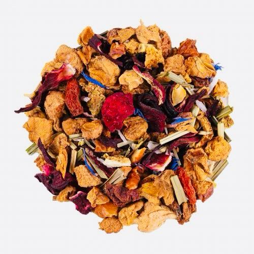 Pomme*, coco*, citronnelle*, hibiscus*, coing*, framboise*, écorces de citron*, arôme naturel de fraise, baie de goji*, arôme naturel de framboise, arôme naturel de cassis, fleurs de bleuet*, arôme naturel de pamplemousse, Huile essentielle de citron vert*.