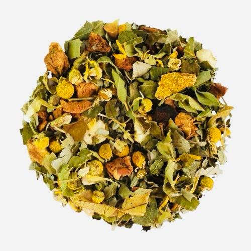 Pomme, feuilles de mûre, écorces d’orange, camomille, mélisse, feuilles de bouleau, verveine entière, arôme naturel d’ylang-ylang, fleurs d’oranger, arôme naturel d’orange, fleurs de soucis, arôme naturel de fleurs d’orange, Huile essentielle de mandarine