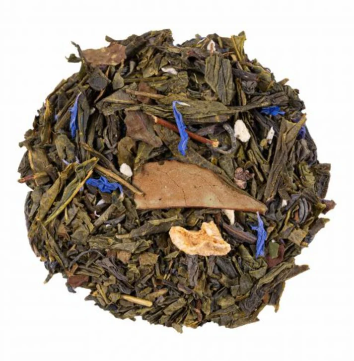 Thé vert de Chine Sencha, thé vert de Chine Chun Mee, thé blanc Pai Mu Tan, fleurs de bleuet, ananas, pêche, arôme naturel.